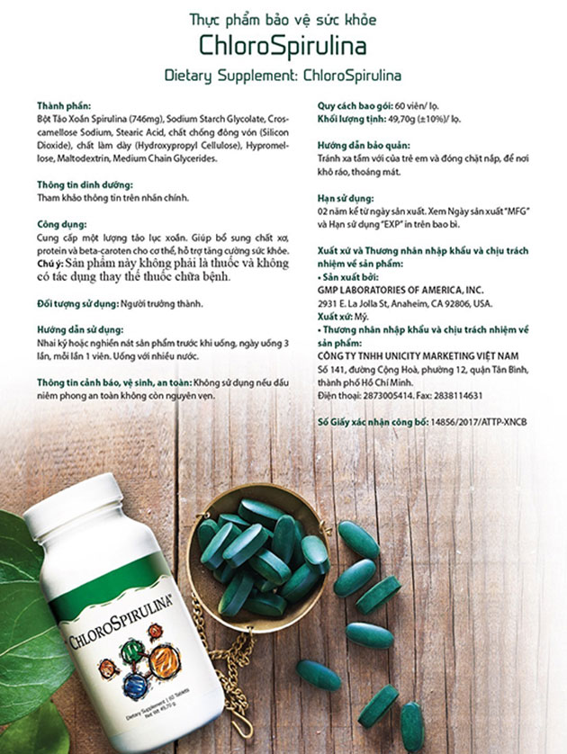 Tảo Chlorospirulina Unicity có chứa thành phần chính là tảo xoắn Spirulina tinh khiết. Tảo xoắn Chlorospirulina Unicity là một loại vi tảo màu xanh lam, giàu chất dinh dưỡng. Mỗi 1 viên nang chứa 746mg bột tảo Spirulina tinh khiết, cung cấp đầy đủ protein, các vitamin, khoáng chất và chất chống oxy hóa thiết yếu cho cơ thể.